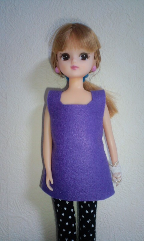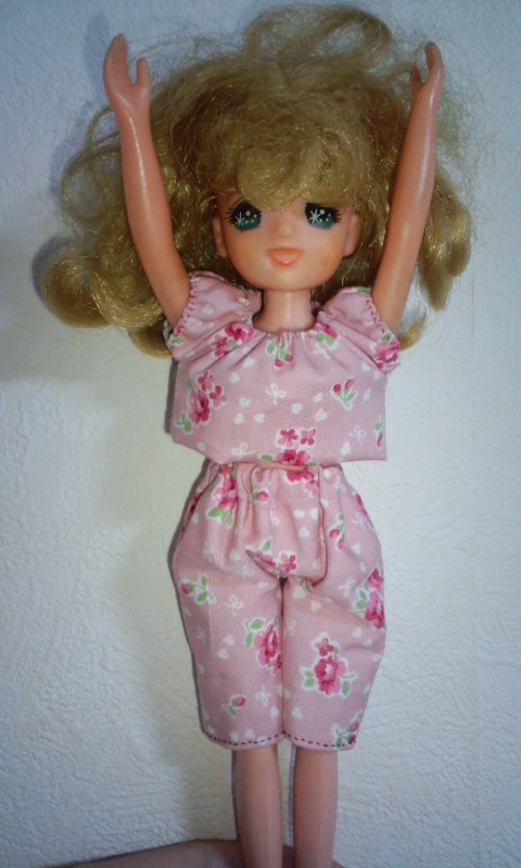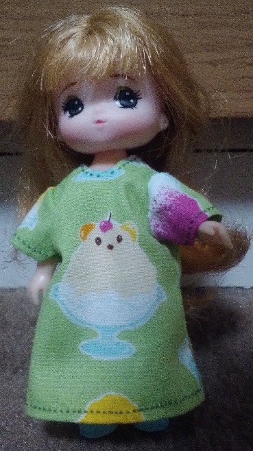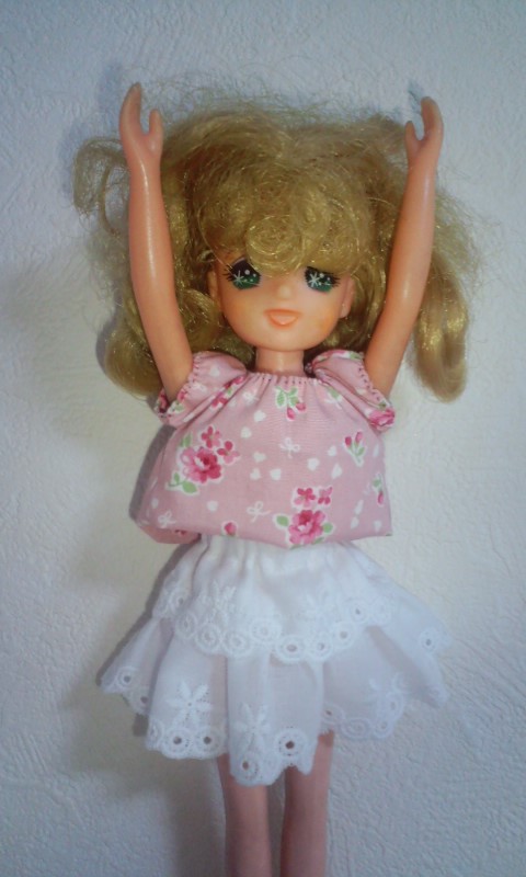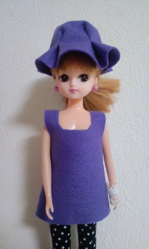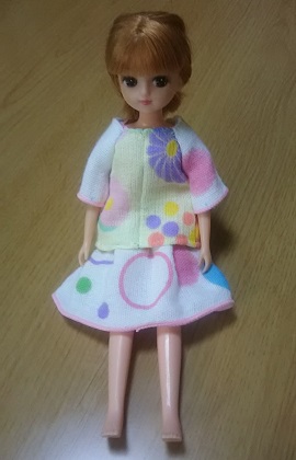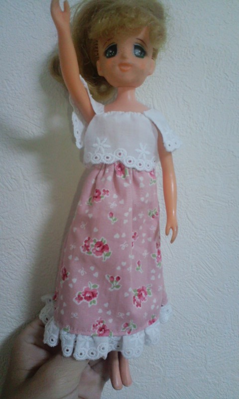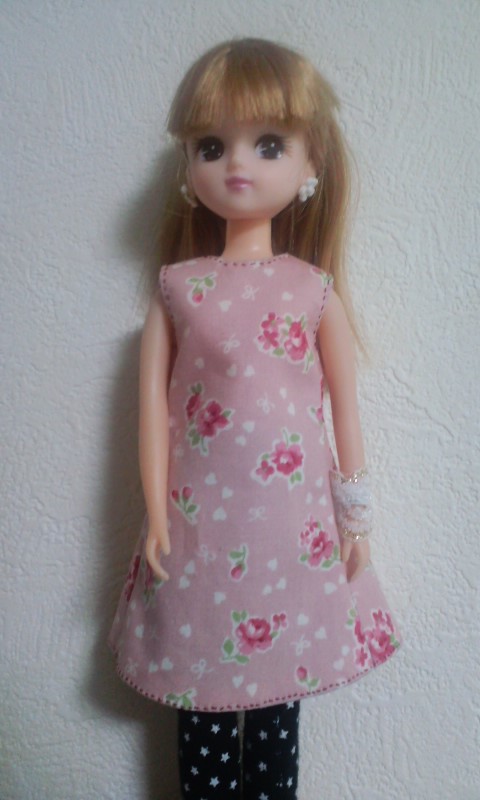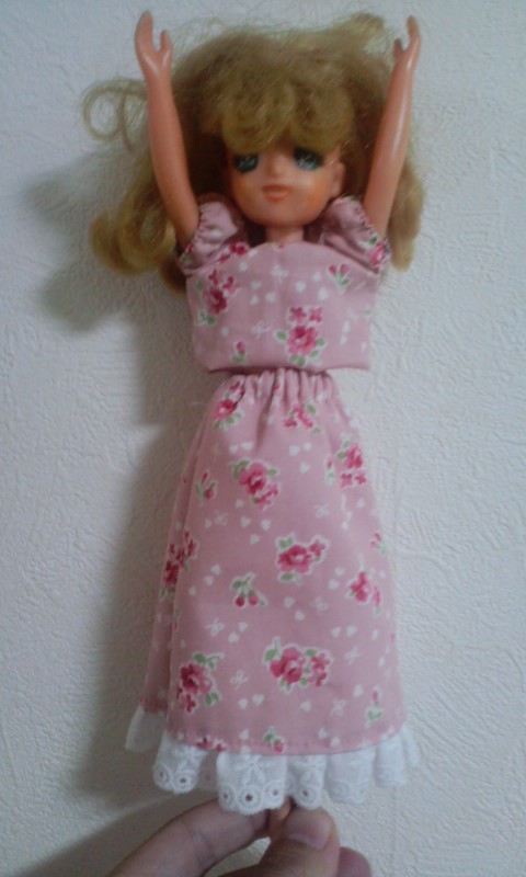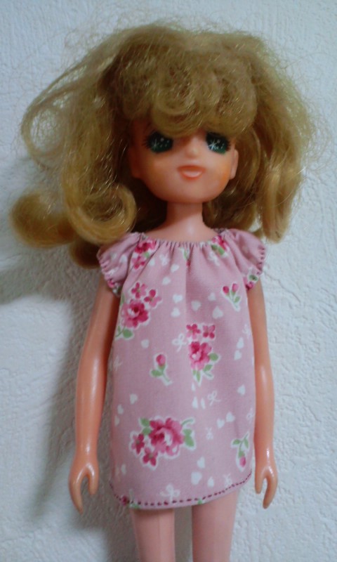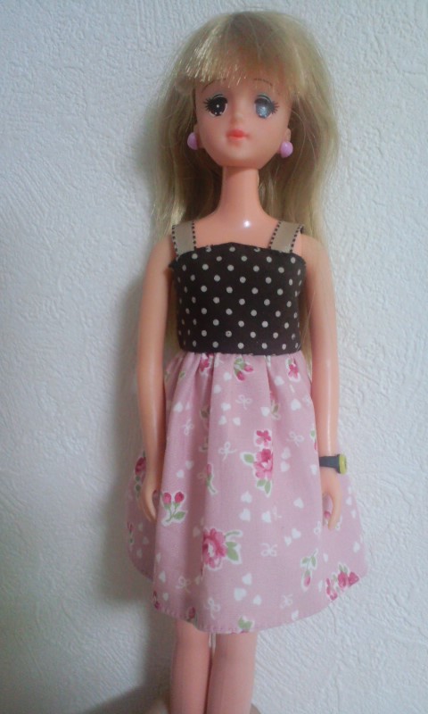 サイト「手作り・人形の服」様の、そでなしワンピース型紙をいただいて、リカちゃん服を作ってみた。 |