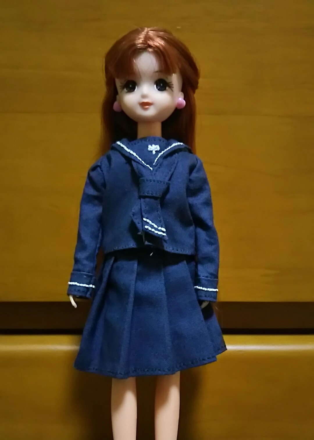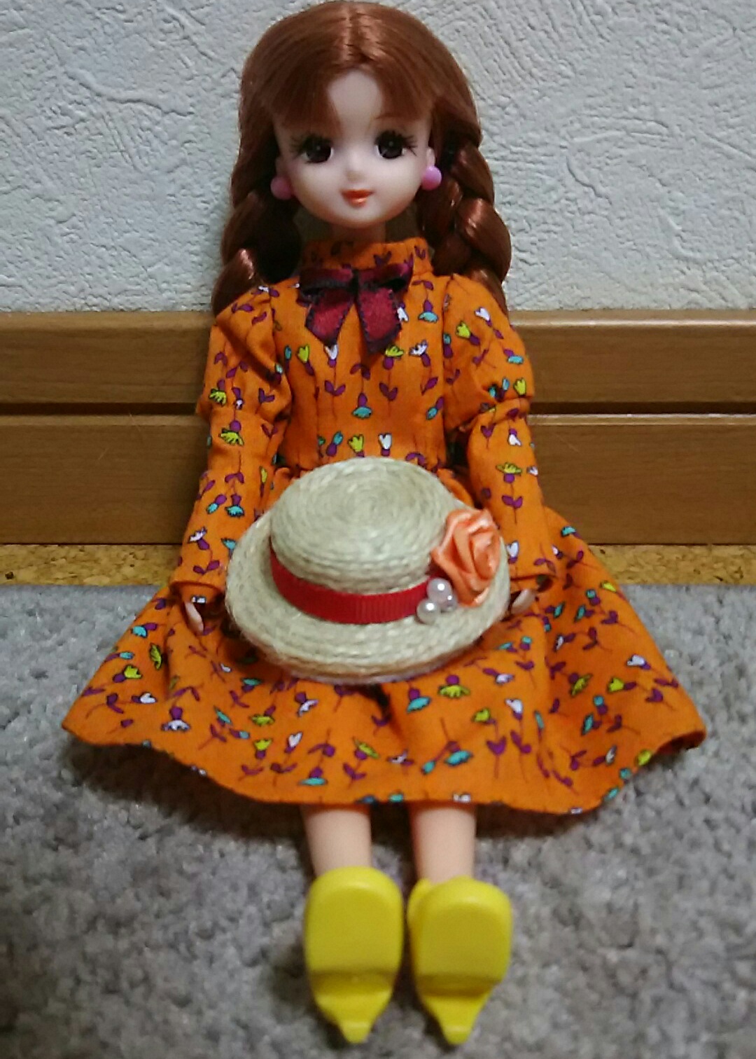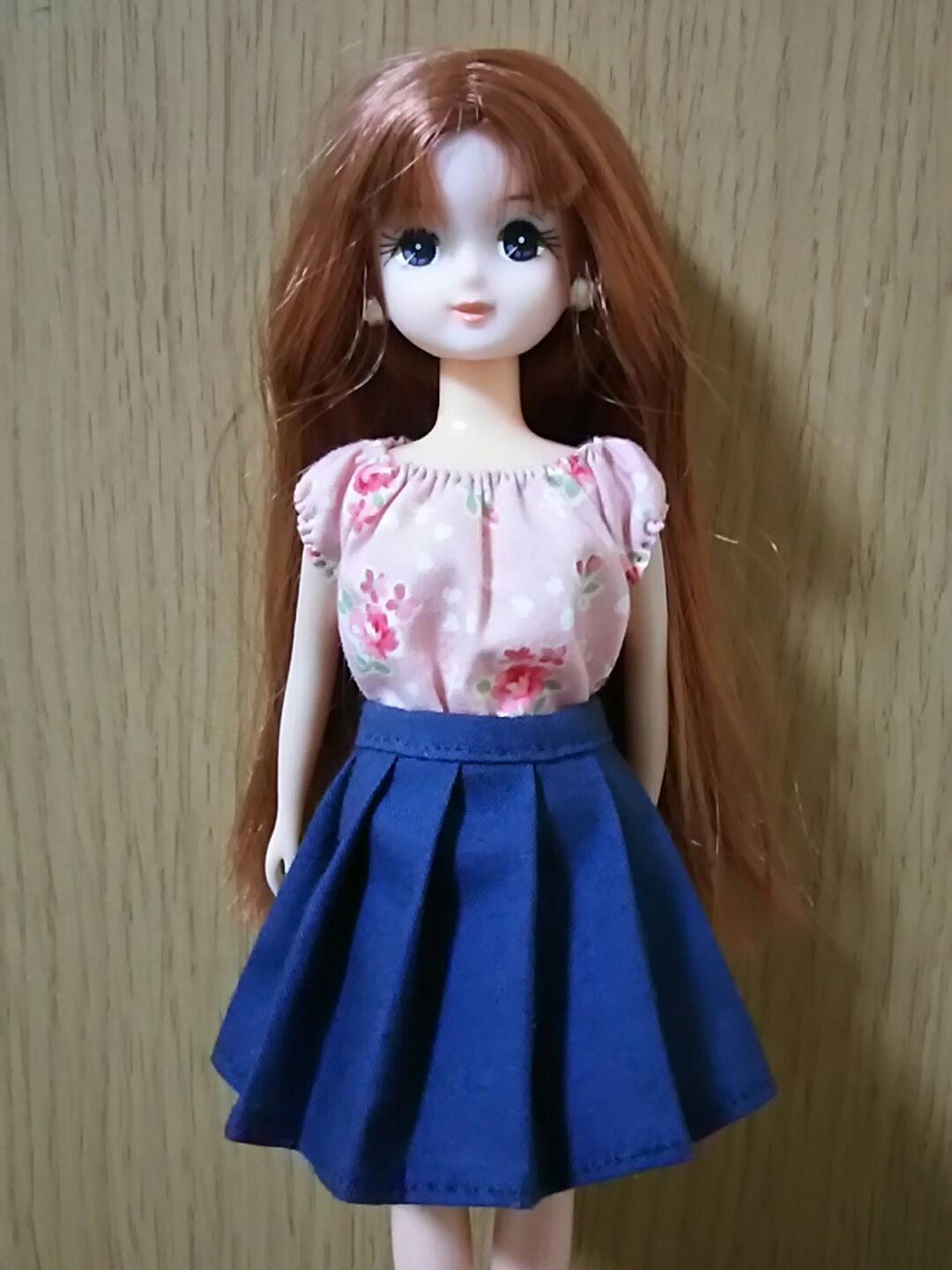 サイト「手作り・人形の服」様の、円形スカートのワンピース型紙をいただいて、リカちゃん服を作ってみた。本来の作り方は袖口を絞るのだけれど、私は面倒臭がりなので省略(汗)。 |